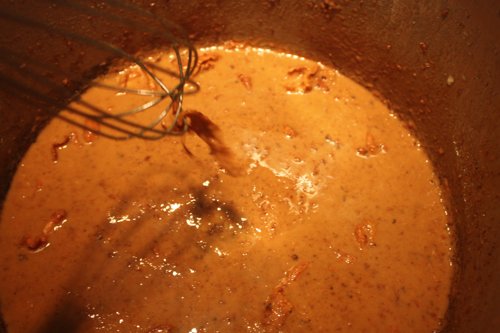 In the same pot (yes there will be little bits of debris in the pot, it's okay), heat the oil and cook the flour in the oil over medium to high heat (depending on your roux-making skill), stirring constantly, until the roux reaches a dark reddish-brown color, almost the color of coffee or milk chocolate for a Cajun-style roux. If you want to save time, or prefer a more New Orleans-style roux, cook it to a medium,